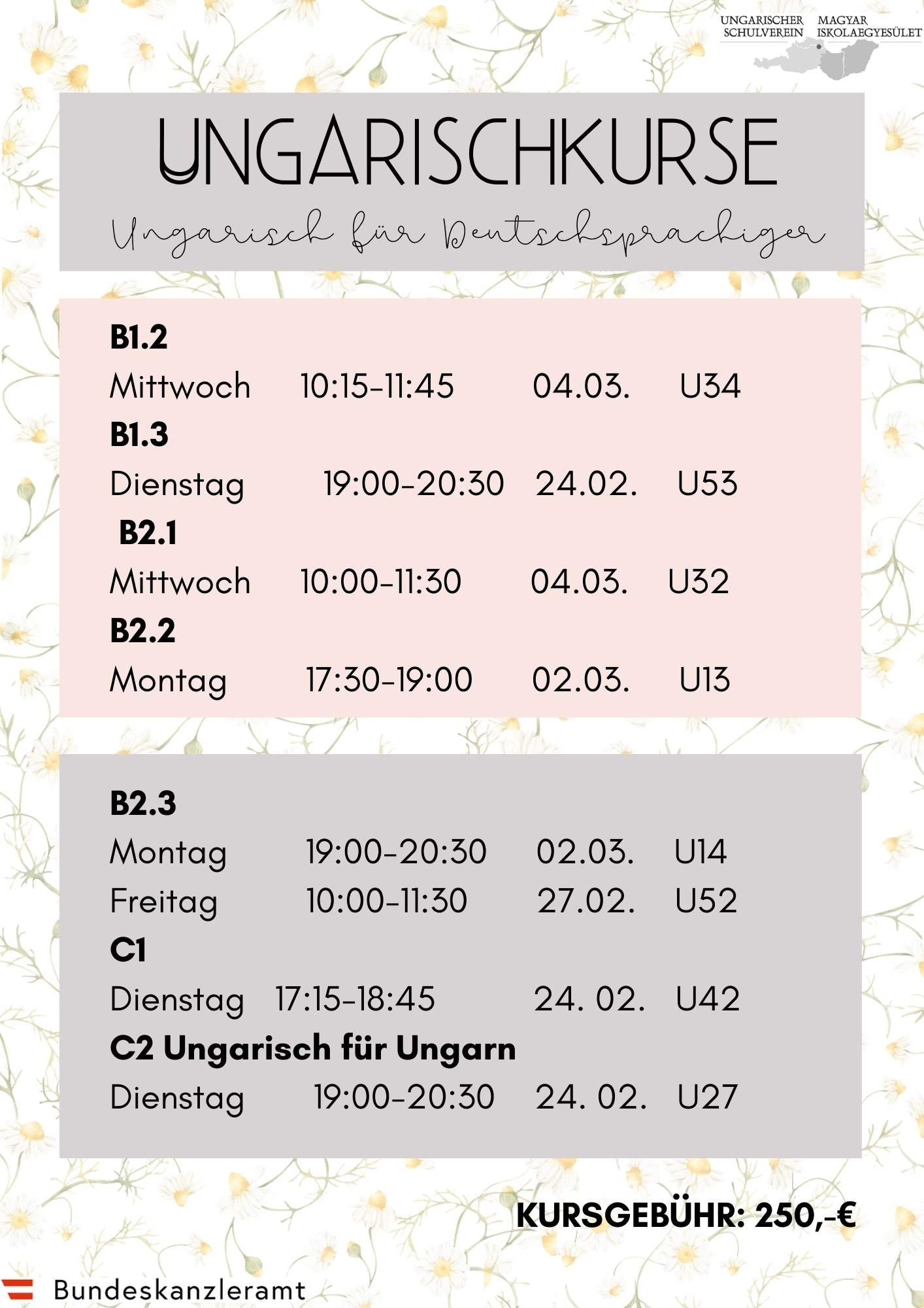 A kurzusok 12 hétig tartanak, heti 2 tanórával.  TANFOLYAMDÍJ: 250,-€